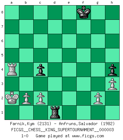 Last move : 1-0 2018 September 29 12:3:41 [Event "FICGS__CHESS__KING_SUPERTOURNAMENT__000003"] [Site "FICGS"] [Date "2018.09.16"] [Round "1"] [White "Farnik,Kym"] [Black "Anfruns,Salvador"] [Result "1-0"] [WhiteElo "2131"] [BlackElo "1982"] 1.e4 e5 2.f4 Nc6 3.Nf3 exf4 4.d4 g5 5.d5 g4 6.dxc6 gxf3 7.Qxf3 dxc6 8.Bxf4 Nf6 9.h3 Be6 10.Nd2 h5 11.O-O-O Bg7 12.Bc4 Bxc4 13.Nxc4 Qe7 14.Ne5 h4 15.Rhf1 Kf8 16.Rde1 Re8 17.Nd3 Nh5 18.Bh2 Qf6 19.Qd1 Qg6 20.Bxc7 Kg8 21.Kb1 Rh6 22.Bf4 Nxf4 23.Rxf4 Qd6 24.a3 b5 25.Qf3 c5 26.Rxf7 c4 27.Rxa7 Rf8 28.e5 Rxf3 29.exd6 Rf8 30.Nc5 Rxd6 31.Ne6 Bd4 32.Nxd4 Rxd4 33.Re5 Rd1+ 34.Ka2 R8f1 35.Re8+ Rf8 36.Rxf8+ Kxf8 37.a4 bxa4 38.Rxa4 1-0 King's gambit Queenside Castling by player White (move 11) 10 pieces endgame at move 38 : White KRPPPP , Black KRPP WHITE : King + 1 Rook 4 Pawns BLACK : King + 1 Rook 2 Pawns Player White won this chess game. Follow this game move after move (download)To avoid losing a piece, many a person has lost the game. (Savielly Tartakover) Im Blitz ist es einfacher mit einer Figur weniger anzugreifen, als sich mit einer Mehrfigur zu verteidigen. (Mikhail Nekhemyevich Tal) Si pudieramos observar el interior de la cabeza de un jugador de Ajedrez, encontraríamos ahí un mundo lleno de sentimientos, imágenes, ideas, emoción y pasión. (Alfred Binet) Horreur, mais aussi harmonie suprême : qu'y avait-il en effet au monde en dehors des échecs ? Le brouillard, l'inconnu, le non-être... (Vladimir Nabokov) Fame, I have already. Now I need the money. (an elderly Steinitz)