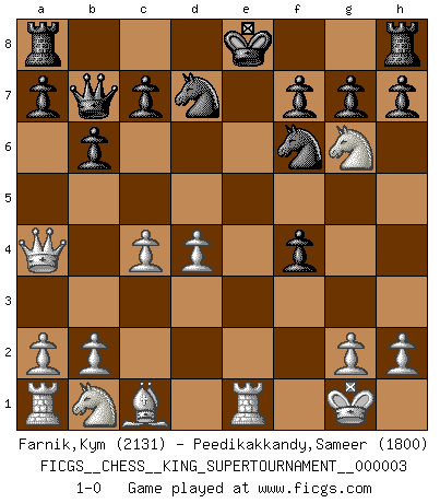 Last move : 1-0 2018 November 1 17:20:36 [Event "FICGS__CHESS__KING_SUPERTOURNAMENT__000003"] [Site "FICGS"] [Date "2018.09.16"] [Round "1"] [White "Farnik,Kym"] [Black "Peedikakkandy,Sameer"] [Result "1-0"] [WhiteElo "2131"] [BlackElo "1800"] 1.e4 e5 2.f4 d5 3.exd5 exf4 4.Nf3 Nf6 5.Bb5+ Bd7 6.Bxd7+ Qxd7 7.O-O Nxd5 8.c4 Nf6 9.d4 b6 10.Ne5 Qd8 11.Qa4+ Nbd7 12.Nc6 Qc8 13.Re1+ Be7 14.Nxe7 Qb7 15.Ng6 1-0 KGD : Falkbeer counter-gambit Kingside Castling by player White (move 7) Player White won this chess game. Follow this game move after move (download)White lost because he failed to remember the right continuation and had to think up the moves himself. (Siegbert Tarrasch) Kann Schach nicht schließlich das Nationalspiel der Deutschen werden? Und welche weiteren Ausblicke bieten sich dann dar! Welche Hebung des allgemeinen Kultur-Niveaus, ja der Moral, wenn das Schachbrett den Kartentisch verdrängen würde! Wahrlich, ein Ziel, des Schweißes der Edlen wert! (Siegbert Tarrasch) Aquellos que dicen que entienden al Ajedrez, no entienden nada. (Robert Hubner) Des idées, des idées, j'en ai cent, j'en ai mille. Des bonnes, des mauvaises, applicables, irréalisables... Il suffit de faire le tri ! (Roos) A mistake is only a mistake if you let it happen twice. Otherwise it is a learning experience. (Daniel Parmet)