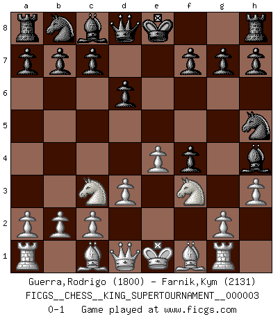 Last move : 0-1 2018 October 21 21:44:57 [Event "FICGS__CHESS__KING_SUPERTOURNAMENT__000003"] [Site "FICGS"] [Date "2018.09.16"] [Round "1"] [White "Guerra,Rodrigo"] [Black "Farnik,Kym"] [Result "0-1"] [WhiteElo "1800"] [BlackElo "2131"] 1.e4 e5 2.f4 exf4 3.Nf3 d6 4.h3 Nf6 5.d3 Nh5 6.Rg1 Be7 7.Nc3 Bh4+ 0-1 This chess game has been lost on time (started : 2018.09.16 2:52:46) KGA : Fischer defense Player Black won this chess game. Follow this game move after move (download)It was clear to me that the vulnerable point of the American Grandmaster (Bobby Fischer) was in double-edged, hanging, irrational positions, where he often failed to find a win even in a won position. (Efim Geller) Sehr viele beherrschen heutzutage das große Einmalseins des Schachspiels und kennen sogar dessen Logarithmentafeln auswendig - deshalb sollte man hin und wieder zu beweisen trachten, dass zwei mal zwei auch fünf sein kann. (Mikhail Nekhemyevich Tal) Coloca el contenido del tablero de Ajedrez en un sombrero, agita las piezas vigorosamente, derrámalas en el tablero desde una altura de medio metro y así obtienes el estilo de Wilhelm Steinitz. (H. E. Bird) Les échecs c'est le défi de l'alpiniste, toujours plus haut, prêt à tout pour monter à l'assaut du Roi ennemi. Les échecs, c'est de la musique en mouvement, un ballet majestueux pour les yeux. C'est de la poésie composée par les fantômes du passé qui au même titre que Rimbaud ou Verlaine méritent notre admiration. Les échecs, c'est de la peinture ou le moindre mouvement modifie le tableau pour en faire un Picasso ou un Van Gogh. Les échecs, c'est tout et rien, c'est la vie et la mort. Jjulie33 sur le forum de France-Echecs. The bottom line is always the bottom line. (Johann Piek)