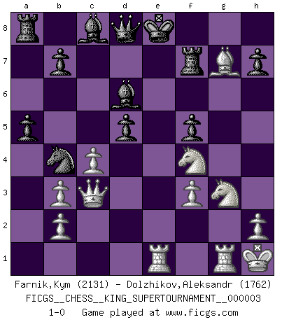Last move : 1-0 2018 November 12 22:29:26 [Event "FICGS__CHESS__KING_SUPERTOURNAMENT__000003"] [Site "FICGS"] [Date "2018.09.16"] [Round "1"] [White "Farnik,Kym"] [Black "Dolzhikov,Aleksandr"] [Result "1-0"] [WhiteElo "2131"] [BlackElo "1762"] 1.e4 e5 2.f4 exf4 3.Bc4 Nc6 4.d4 Nf6 5.Nc3 Bb4 6.Nge2 f3 7.gxf3 d5 8.exd5 Nxd5 9.O-O Nb6 10.Bb3 Na5 11.Qd3 O-O 12.Ne4 Be7 13.Bd2 Nxb3 14.axb3 Nd5 15.c4 Nb4 16.Qc3 a5 17.Kh1 c6 18.Rg1 f5 19.Bh6 Rf7 20.d5 Kf8 21.Bxg7+ Ke8 22.N4g3 cxd5 23.Nf4 Bd6 24.Rae1+ 1-0 This chess game has been lost on time (started : 2018.09.16 2:52:46) KGA : Bishop's gambit, Maurian defense Kingside Castling by player White (move 9) Kingside Castling by player Black (move 11) Player White won this chess game. Follow this game move after move (download)If cunning alone were needed to excel, women would be the best Chess players. (Albin) Das Schachspiel ist ein See, in welchem eine Mücke baden und ein Elefant ertrinken kann. (Emanuel Lasker) Solo los afeminados hacen el Enroque. (Rob Sillars) Les échecs sont un jeu par leur forme, un art par leur essence et une science par sa difficulté d'acquisition. Ils peuvent vous procurer autant de plaisir qu'un bon livre ou une belle musique, mais vous n'aurez une réelle joie que si vous arrivez à bien jouer. (Tigran Petrosian) Difficult things take a long time, impossible things a little longer. (Author unknown)