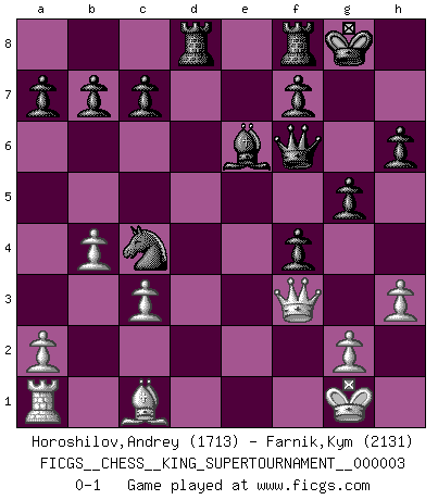 Last move : 0-1 2018 October 15 8:51:29 [Event "FICGS__CHESS__KING_SUPERTOURNAMENT__000003"] [Site "FICGS"] [Date "2018.09.16"] [Round "1"] [White "Horoshilov,Andrey"] [Black "Farnik,Kym"] [Result "0-1"] [WhiteElo "1713"] [BlackElo "2131"] 1.e4 e5 2.f4 exf4 3.Nf3 d6 4.d4 g5 5.h3 h6 6.Bc4 Bg7 7.O-O Ne7 8.Nc3 O-O 9.Nd5 Ng6 10.e5 dxe5 11.dxe5 Nxe5 12.Nxe5 Bxe5 13.Re1 Nc6 14.c3 Be6 15.Rxe5 Nxe5 16.b4 Nxc4 17.Nf6+ Qxf6 18.Qf3 Rad8 0-1 KGA : Fischer defense Kingside Castling by player White (move 7) Kingside Castling by player Black (move 8) Player Black won this chess game. Follow this game move after move (download)My God, Bobby Fischer plays so simply. (Alexei Suetin) Ich habe kein Problem mit Frauen, sondern nur mit dem Niveau ihres Schachspiels (Judith Polgar) El Ajedrez detiene a su maestro dentro de sus propios vínculos, encadenando la mente y el cerebro, por lo que la libertad interior del mas fuerte debe sufrir. (Albert Einstein) Ce qui caractérise les parties de combat, c'est que si le défenseur a constamment de difficiles problèmes à résoudre, l'attaquant doit chercher sans relâche de nouvelles possibilités d'attaque. (Koblentz) Once you start thinking you have nothing left to learn, you have everything to learn. (Steve Badget)