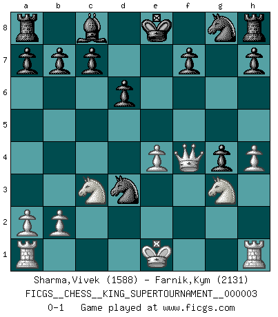 Last move : 0-1 2018 October 14 14:36:59 [Event "FICGS__CHESS__KING_SUPERTOURNAMENT__000003"] [Site "FICGS"] [Date "2018.09.16"] [Round "1"] [White "Sharma,Vivek"] [Black "Farnik,Kym"] [Result "0-1"] [WhiteElo "1588"] [BlackElo "2131"] 1.e4 e5 2.f4 exf4 3.Nf3 d6 4.d4 g5 5.h4 g4 6.Ng1 Bh6 7.Ne2 Qf6 8.g3 fxg3 9.Nxg3 Bxc1 10.Qxc1 Qxd4 11.Bd3 Nc6 12.Nc3 Ne5 13.Qf4 Qxd3 14.cxd3 Nxd3+ 0-1 KGA : Fischer defense Player Black won this chess game. Follow this game move after move (download)You can only get good at Chess if you love the game. (Bobby Fischer) Heutzutage gewinnt im Turnier nicht derjenige Spieler, der weitreichende Pläne entwirft, sondern einfach jener, der Zug um Zug kämpft. (David Bronstein) Fischer es una tragedia del Ajedrez Americano a la par con Morphy y Pillsbury. (Mig Greengard) Aux échecs, l'amour-propre est satisfait quand on remporte la victoire, mais il n'y a pas de honte à être battu. (Benjamin Franklin) Animated gif is worth one mega-word. (Unknown)