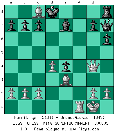 Last move : 1-0 2018 November 4 15:52:38 [Event "FICGS__CHESS__KING_SUPERTOURNAMENT__000003"] [Site "FICGS"] [Date "2018.09.16"] [Round "1"] [White "Farnik,Kym"] [Black "Bromo,Alexis"] [Result "1-0"] [WhiteElo "2131"] [BlackElo "1349"] 1.e4 e5 2.f4 d6 3.d3 Nc6 4.Nf3 h6 5.Nc3 Bg4 6.Be2 Nf6 7.O-O Be7 8.Nd5 Nxd5 9.exd5 Nd4 10.Nxd4 Bd7 11.fxe5 dxe5 12.Ne6 Bxe6 13.dxe6 fxe6 14.Bh5+ Kd7 15.Be3 Qg8 16.d4 e4 17.Bf7 Qh7 18.Qg4 Raf8 19.Bxe6+ Kd8 20.Bc8 Rxf1+ 21.Rxf1 1-0 King's gambit Kingside Castling by player White (move 7) Player White won this chess game. Follow this game move after move (download)The stomach is an essential part of the Chess master. (Bent Larsen) Drei Punkte vor allen anderen ist wie einer, der im weißen Anzug posiert, während der Rest in Müllsäcke gekleidet dasteht. (Viktor Kortschnoi) En el Ajedrez, tal como es jugado por los Maestros, practicamente la suerte es eliminada. (Emanuel Lasker) Il n'y a pas eu de défaite parce que je ne crois pas que cet ordinateur ait jamais existé. IBM a triché en refusant d'imprimer les modes de recherche de la machine. C'est évident, pendant le match, des coups décisifs ont été joués par des êtres humains. Aujourd'hui, les meilleurs spécialistes en informatique ne peuvent toujours pas expliquer comment Deep-Blue a pu jouer contre la logique des ordinateurs. IBM a gagné une guerre de communication, mais ils sont incapables de prouver que l'ordinateur a gagné tout seul. (Garry Kasparov) Life is like internet, nothing interesting, but noone want to leave it. (Ilmars Cirulis)