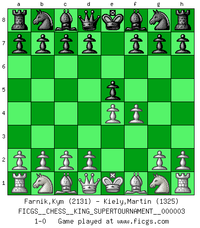 Last move : 1-0 2018 October 16 8:55:46 [Event "FICGS__CHESS__KING_SUPERTOURNAMENT__000003"] [Site "FICGS"] [Date "2018.09.16"] [Round "1"] [White "Farnik,Kym"] [Black "Kiely,Martin"] [Result "1-0"] [WhiteElo "2131"] [BlackElo "1325"] 1.e4 e5 2.f4 1-0 This chess game has been lost on time (started : 2018.09.16 2:52:46) King's gambit Player White won this chess game. Follow this game move after move (download)A good sacrifice is one that is not necessarily sound but leaves your opponent dazed and confused. (Rudolph Spielmann) Bis jetzt ist Weiß einer wohlbekannten Analyse gefolgt. Aber jetzt begeht er einen schrecklichen Fehler: Er beginnt seinen eigenen Kopf zu benutzen. (Siegbert Tarrasch) El Ajedrez es el arte del análisis. (Mikhail Botvinnik) Les échecs sont utiles à l'exercice de la faculté de penser et à celle de l'imagination. Car nous devons posséder une méthode élaborée pour atteindre des buts partout où nous devons conduire notre raison. (Leibnitz) There is a very easy way to return from a casino with a small fortune : go there with a large one. (Jack Yelton)