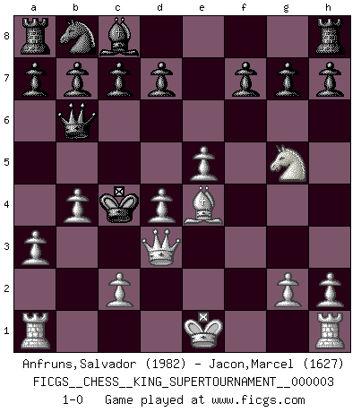 Last move : 1-0 2018 September 21 21:26:43 [Event "FICGS__CHESS__KING_SUPERTOURNAMENT__000003"] [Site "FICGS"] [Date "2018.09.16"] [Round "1"] [White "Anfruns,Salvador"] [Black "Jacon,Marcel"] [Result "1-0"] [WhiteElo "1982"] [BlackElo "1627"] 1.e4 e5 2.f4 exf4 3.Nf3 Nf6 4.e5 Ne4 5.d3 Nc5 6.d4 Ne4 7.Bd3 Ng5 8.Bxf4 Qe7 9.Bxg5 Qb4+ 10.Nc3 Be7 11.a3 Qa5 12.Bxe7 Kxe7 13.b4 Qb6 14.Nd5+ Ke6 15.Ng5+ Kxd5 16.Be4+ Kc4 17.Qd3+ 1-0 KGA : Schallop defense Player White won this chess game. Follow this game move after move (download)The most powerful weapon in Chess is to have the next move. (David Bronstein) Ja, ich habe einmal eine Blitzpartie gespielt, es war in einem Zug, 1929. --im Interview 1989 (Mikhail Moiseyevich Botvinik) Si tu oponente te ofrece un empate, trata de averiguar porque piensa él que esta en una posición peor. (Nigel Short) Même si vous avez un bon coup à faire, regardez toujours s'il n'y en a pas un qui lui soit préférable. (Pedro Damiano) Panic is a sudden desertion of us, an a going over to the enemy of our imagination. (Christian Nevell Bovee)
