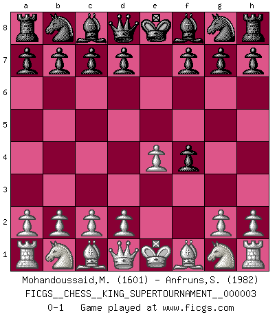 Last move : 0-1 2018 October 16 20:58:30 [Event "FICGS__CHESS__KING_SUPERTOURNAMENT__000003"] [Site "FICGS"] [Date "2018.09.16"] [Round "1"] [White "Mohandoussaid,Malik"] [Black "Anfruns,Salvador"] [Result "0-1"] [WhiteElo "1601"] [BlackElo "1982"] 1.e4 e5 2.f4 exf4 0-1 This chess game has been lost on time (started : 2018.09.16 2:52:46) King's gambit accepted Player Black won this chess game. Follow this game move after move (download)Fischer Chess play was always razor-sharp, rational and brilliant. One of the best ever. (Dave Regis) Konzentriere dich auf materielle Gewinne. Nimm, was dir dein Gegner gibt, ausser es gibt einen guten Grund der dagegenspricht. (Robert James Fischer) En posiciones complicadas, Bobby Fischer pocas veces tuvo que temer de cualquiera. (Paul Keres) Les échecs sont utiles à l'exercice de la faculté de penser et à celle de l'imagination. Car nous devons posséder une méthode élaborée pour atteindre des buts partout où nous devons conduire notre raison. (Leibnitz) The various flowers seem good to different people. (Chinese proverb)