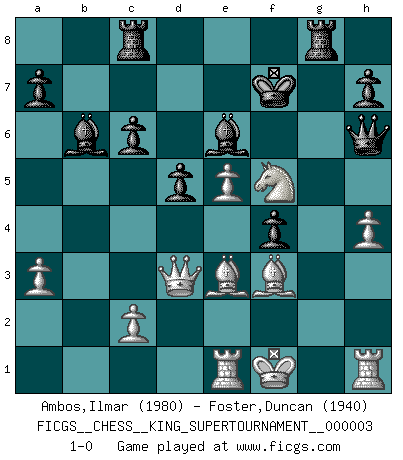 Last move : 1-0 2018 December 28 23:24:57 [Event "FICGS__CHESS__KING_SUPERTOURNAMENT__000003"] [Site "FICGS"] [Date "2018.09.16"] [Round "1"] [White "Ambos,Ilmar"] [Black "Foster,Duncan"] [Result "1-0"] [WhiteElo "1980"] [BlackElo "1940"] 1.e4 e5 2.f4 exf4 3.Nf3 g5 4.h4 g4 5.Ne5 Nf6 6.Nxg4 Nxe4 7.d3 Ng3 8.Bxf4 Qe7+ 9.Be2 Rg8 10.Bxg3 Rxg4 11.Bf2 Rxg2 12.Nc3 Nc6 13.Kf1 Rg8 14.Bh5 Qe6 15.Qf3 Ne5 16.Qe4 d6 17.Re1 Qh6 18.Bf3 c6 19.d4 f5 20.Qe2 Be6 21.dxe5 d5 22.Qd3 Bb4 23.a3 Ba5 24.b4 Bc7 25.b5 Kf7 26.Ne2 Bb6 27.bxc6 bxc6 28.Nd4 Rac8 29.Be3 f4 30.Nf5 1-0 KGA : Kieseritsky, Berlin defense Player White won this chess game. Follow this game move after move (download)Chess, like love, like music, has the power to make people happy. (Siegbert Tarrasch) Als ich elf wurde, wurde ich einfach gut. (Robert James Fischer) Yo no le temo a Spassky. Todos saben que yo soy el mejor. Uno no necesita un torneo para probarlo. (Bobby Fischer) Les échecs, c'est l'art d'analyser. (Mikhail Botvinnik) Life is like a ten-speed bicycle: most of us have gears we never use. (Charles M. Schulz)