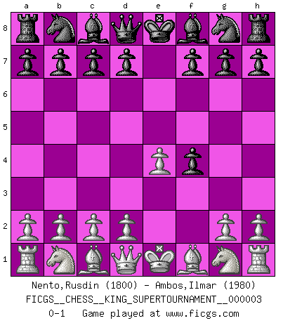 Last move : 0-1 2018 October 17 9:15:1 [Event "FICGS__CHESS__KING_SUPERTOURNAMENT__000003"] [Site "FICGS"] [Date "2018.09.16"] [Round "1"] [White "Nento,Rusdin"] [Black "Ambos,Ilmar"] [Result "0-1"] [WhiteElo "1800"] [BlackElo "1980"] 1.e4 e5 2.f4 exf4 0-1 This chess game has been lost on time (started : 2018.09.16 2:52:46) King's gambit accepted Player Black won this chess game. Follow this game move after move (download)As one by one I mowed them down, my superiority soon became apparent. (Jose Capablanca) Jeder Fehler erscheint unglaublich dumm, wenn andre ihn begehen. (Georg Christoph Lichtenberg) Tu eres para mi la Reina en d8 y yo soy el Peón en d7!!. (GM Eduard Gufeld) On n'a jamais que l'âge auquel on a commence à jouer aux échecs car après on cesse de vieillir. (Capablanca) Information on the Internet is subject to the same rules and regulations as conversation at a bar. (George Lundberg)