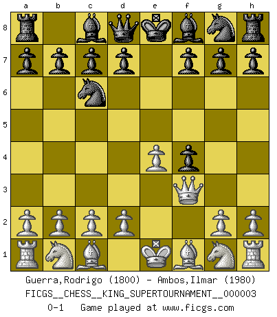 Last move : 0-1 2018 October 27 10:0:33 [Event "FICGS__CHESS__KING_SUPERTOURNAMENT__000003"] [Site "FICGS"] [Date "2018.09.16"] [Round "1"] [White "Guerra,Rodrigo"] [Black "Ambos,Ilmar"] [Result "0-1"] [WhiteElo "1800"] [BlackElo "1980"] 1.e4 e5 2.f4 exf4 3.Qf3 Nc6 0-1 This chess game has been lost on time (started : 2018.09.16 2:52:46) KGA : Breyer gambit Player Black won this chess game. Follow this game move after move (download)Chess is so inspiring that I do not believe a good player is capable of having an evil thought during the game. (Wilhelm Steinitz) Es hat in meinem Leben Zeiten gegeben, in denen das Schachspiel, wenn nicht zum Lebenszweck, so doch zu einem regelrechten Lebensersatz geworden ist. Man fühlt sich in solchen Zeiten nicht so, als besäße man eine göttliche Gabe, sondern eher so, als sei man von ihr besessen. (Garry Kasparov) Si tu oponente te ofrece un empate, trata de averiguar porque piensa él que esta en una posición peor. (Nigel Short) La victoire dans une partie d'Echecs appartient la plupart du temps à celui qui voit un peu plus loin que l'adversaire. (Lasker) Remember : Your focus determines your reality. (Qui-Gon Jinn in Star Wars ep.1)