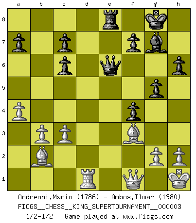 Last move : 1/2-1/2 2018 November 24 19:56:9 [Event "FICGS__CHESS__KING_SUPERTOURNAMENT__000003"] [Site "FICGS"] [Date "2018.09.16"] [Round "1"] [White "Andreoni,Mario"] [Black "Ambos,Ilmar"] [Result "1/2-1/2"] [WhiteElo "1786"] [BlackElo "1980"] 1.e4 e5 2.f4 exf4 3.Nf3 d6 4.d4 g5 5.Bc4 h6 6.O-O Nc6 7.c3 Nf6 8.Re1 Bg7 9.e5 dxe5 10.Nxe5 O-O 11.Nxc6 bxc6 12.Nd2 Bg4 13.Nf3 Qd6 14.b3 Rfe8 15.a4 Nd5 16.Bxd5 Rxe1+ 17.Qxe1 Bxf3 18.Bxf3 Bxd4+ 19.Kh1 Bg7 20.Bb2 Qd7 21.Rd1 Re8 22.Qf1 Qe6 23.Qc4 Qe1+ 24.Qf1 Qe6 25.Qc4 Qe1+ 26.Qf1 Qe6 1/2-1/2 KGA : Fischer defense Kingside Castling by player White (move 6) Kingside Castling by player Black (move 10) This chess game ended in a draw. Follow this game move after move (download)Not all artists are Chess players, but all Chess players are artists. (Marcel Duchamp) Im Leben werden Partien nie so unstrittig gewonnen wie im Spiel (Emanuel Lasker) Por esta medida (el intervalo entre Fischer y sus contemporaneos), yo le considero el mas grande campeón mundial. (Garry Kasparov) L'action d'une oeuvre littéraire se déroule sur un champ de bataille. Les masques et les types du drame moderne correspondent aux pièces du jeu d'échecs. L'intrigue correspond aux coups et aux gambits, c'est à dire aux techniques du jeu telles qu'utilisées et interprétées par les joueurs. Les tactiques et les péripéties [mouvements] correspondent aux coups exécutés par l'adversaire. (Viktor Shklovsky) A cynic is a man who knows the price of everything but the value of nothing. (Oscar Wilde)