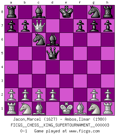 Last move : 0-1 2018 November 9 10:15:8 [Event "FICGS__CHESS__KING_SUPERTOURNAMENT__000003"] [Site "FICGS"] [Date "2018.09.16"] [Round "1"] [White "Jacon,Marcel"] [Black "Ambos,Ilmar"] [Result "0-1"] [WhiteElo "1627"] [BlackElo "1980"] 1.e4 e5 2.f4 exf4 3.Qf3 Nc6 4.Qxf4 d5 5.exd5 Qxd5 6.Qxc7 Bd6 0-1 This chess game has been lost on time (started : 2018.09.16 2:52:46) KGA : Breyer gambit Player Black won this chess game. Follow this game move after move (download)The Chess pieces are the block alphabet which shapes thoughts; and these thoughts, although making a visual design on the chessboard, express their beauty abstractly, like a poem. (Marcel Duchamp) Meine Liebe ist Schach, Schach, Schach. Ich muss jeden Tag Schach spielen, deshalb fühle ich mich so stark. (Miguel Najdorf) Sin errores no puede haber brillantez. (Emanuel Lasker) Pour se monter efficace, un Cavalier a besoin d'avant-postes ! Les Cavaliers font les meilleurs bloqueurs de pions passés. The large trees attract high winds. (Chinese proverb)