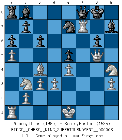 Last move : 1-0 2018 November 15 22:42:30 [Event "FICGS__CHESS__KING_SUPERTOURNAMENT__000003"] [Site "FICGS"] [Date "2018.09.16"] [Round "1"] [White "Ambos,Ilmar"] [Black "Senis,Enrico"] [Result "1-0"] [WhiteElo "1980"] [BlackElo "1625"] 1.e4 e5 2.f4 d6 3.fxe5 dxe5 4.Nf3 Bc5 5.Bc4 Nf6 6.Qe2 O-O 7.d3 Nc6 8.c3 Bg4 9.Nbd2 Qe7 10.Nb3 Bb6 11.a4 a6 12.a5 Ba7 13.Be3 Bb8 14.Bc5 Qe8 15.Bxf8 Qxf8 16.h3 Bh5 17.g4 Bg6 18.Nh4 Ne7 19.Rf1 h6 20.Qd2 Bh7 21.g5 hxg5 22.Qxg5 c6 23.Rxf6 g6 24.Rxf7 1-0 King's gambit Kingside Castling by player Black (move 6) Player White won this chess game. Follow this game move after move (download)Fischer prefers to enter Chess history alone. (Miguel Najdorf) Am wohlsten fühle ich mich, wenn ich sehe, wie sich mein Gegner im Todeskampf windet. (Robert James Fischer) El Ajedrez es despiadado: debes de estar preparado para matar gente. (Nigel Short) Avant la finale, les dieux ont créé le milieu de partie. (Tarrasch) I find television to be very educating. Every time somebody turns on the set, I go in the other room and read a book. (Groucho Marx)