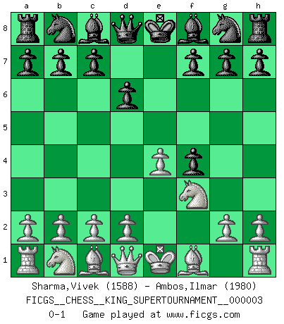 Last move : 0-1 2018 October 28 9:7:21 [Event "FICGS__CHESS__KING_SUPERTOURNAMENT__000003"] [Site "FICGS"] [Date "2018.09.16"] [Round "1"] [White "Sharma,Vivek"] [Black "Ambos,Ilmar"] [Result "0-1"] [WhiteElo "1588"] [BlackElo "1980"] 1.e4 e5 2.f4 exf4 3.Nf3 d6 0-1 This chess game has been lost on time (started : 2018.09.16 2:52:46) KGA : Fischer defense Player Black won this chess game. Follow this game move after move (download)At this time Fischer is simply a level above all the best Chessplayers in the world. (John Jacobs) Jeder Schachmeister war einmal ein Anfänger. (Irving Chernev) El poder defensivo de una pieza clavada, solamente es imaginario. (Aaron Nimzovich) Le système Elo représente seulement une moyenne. Il est simplement un indicateur de votre stabilité. (Anatoli Karpov) Secret operations are essential in war; upon them the army relies to make its every move. (Sun Tzu)