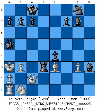 Last move : 0-1 2018 November 3 7:16:30 [Event "FICGS__CHESS__KING_SUPERTOURNAMENT__000003"] [Site "FICGS"] [Date "2018.09.16"] [Round "1"] [White "Cirovic,Zeljko"] [Black "Ambos,Ilmar"] [Result "0-1"] [WhiteElo "1348"] [BlackElo "1980"] 1.e4 e5 2.f4 exf4 3.Nf3 d6 4.d4 g5 5.Bc4 h6 6.h4 Bg7 7.hxg5 hxg5 8.e5 Rxh1+ 9.Bf1 g4 10.Bxf4 gxf3 11.Qxf3 Nc6 12.g3 Rxf1+ 13.Kxf1 Nxd4 14.Qd3 dxe5 15.Be3 Bh3+ 16.Kf2 Qf6+ 17.Ke1 Nxc2+ 18.Qxc2 Qf1+ 19.Kd2 O-O-O 20.Kc3 e4 21.Kb3 Qb5+ 22.Ka3 Rd3+ 23.b3 Qa5+ 0-1 KGA : Fischer defense Queenside Castling by player Black (move 19) Player Black won this chess game. Follow this game move after move (download)Every Pawn is a potential Queen. (James Mason) Der Traum, für den ich lebe, ist der von einem freien Russland. Viele mögen sagen: Russland hat doch ein Parlament, einen gewählten Präsidenten. Aber ich spüre, dass in meiner Heimat die Angst wiederkehrt. Eine Angst, sich frei zu äußern, bestimmte Dinge zu tun (Garry Kasparov) Sin errores no puede haber brillantez. (Emanuel Lasker) Vouloir jouer aux échecs contre soi-même est aussi paradoxal que vouloir marcher sur son ombre. (Stefan Zweig) Follow your passion, and success will follow you. (Arthur Buddhold)