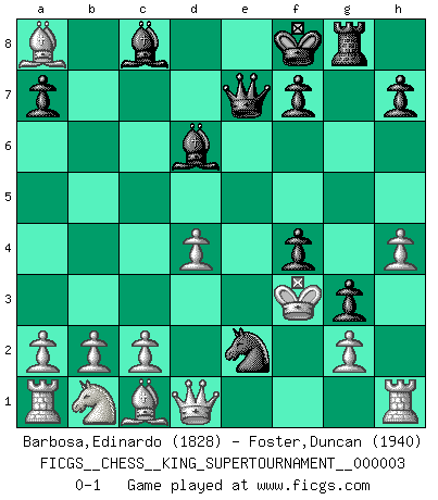 Last move : 0-1 2018 October 12 18:13:13 [Event "FICGS__CHESS__KING_SUPERTOURNAMENT__000003"] [Site "FICGS"] [Date "2018.09.16"] [Round "1"] [White "Barbosa,Edinardo"] [Black "Foster,Duncan"] [Result "0-1"] [WhiteElo "1828"] [BlackElo "1940"] 1.e4 e5 2.f4 exf4 3.Nf3 g5 4.h4 g4 5.Ne5 Nf6 6.Bc4 d5 7.exd5 Bd6 8.d4 Nh5 9.Bb5+ c6 10.dxc6 Nxc6 11.Nxc6 bxc6 12.Bxc6+ Kf8 13.Bxa8 Ng3 14.Rh2 Qe7+ 15.Kf2 Ne2 16.Rh1 g3+ 17.Kf3 Rg8 0-1 KGA : Kieseritsky, Berlin defense, 6.Bc4 Player Black won this chess game. Follow this game move after move (download)Winning isn't everything... but losing is nothing. (Mednis) Die Neutralität betrachte ich als eine schwere Krankheit. (Viktor Kortschnoi) La única cosa que los jugadores de Ajedrez tienen en común, es el Ajedrez. (Lodewijk Prins) Il n'y a plus de joueurs du niveau de Jacob Murray dont la seule quête est le beau jeu, le plaisir de voir les pièces construire quelque chose. Sur 10 idées à la minute, 9 seront sans intérêt, la dernière s'avèrera géniale. (Christian Bauer) Hold em is to stud what chess is to checkers. (Johnny Moss)
