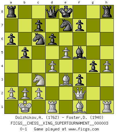 Last move : 0-1 2018 November 11 22:28:31 [Event "FICGS__CHESS__KING_SUPERTOURNAMENT__000003"] [Site "FICGS"] [Date "2018.09.16"] [Round "1"] [White "Dolzhikov,Aleksandr"] [Black "Foster,Duncan"] [Result "0-1"] [WhiteElo "1762"] [BlackElo "1940"] 1.e4 e5 2.f4 exf4 3.Nf3 g5 4.Nc3 Bg7 5.g3 d6 6.d4 g4 7.Nh4 f3 8.h3 h5 9.Be3 Nc6 10.Qd2 Bf6 11.Qf2 a6 12.O-O-O Nge7 13.Kb1 b5 14.e5 Bxh4 15.gxh4 Bf5 16.hxg4 hxg4 0-1 This chess game has been lost on time (started : 2018.09.16 2:52:46) KGA : Quaade gambit Queenside Castling by player White (move 12) Player Black won this chess game. Follow this game move after move (download)A man that will take back a move at Chess will pick a pocket. (Richard Fenton) Computer sind die einzigen Gegner, die nicht immer eine Ausrede auf Lager haben, wenn sie gegen mich verlieren. (Robert James Fischer) Creo que una cierta cantidad de temperamento es esperada de los genios del Ajedrez. (Ron Gross) Même si vous avez un bon coup à faire, regardez toujours s'il n'y en a pas un qui lui soit préférable. (Pedro Damiano) CHESS, n. f. [echecs, Fr.] A nice and abstruse game, in which two sets of puppets are moved in opposition to each other. (Dr Samuel Johnson, A Dictionary Of The English Language, 1755)