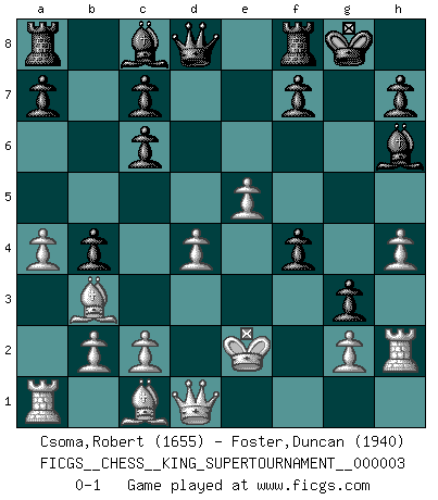Last move : 0-1 2018 October 3 16:59:23 [Event "FICGS__CHESS__KING_SUPERTOURNAMENT__000003"] [Site "FICGS"] [Date "2018.09.16"] [Round "1"] [White "Csoma,Robert"] [Black "Foster,Duncan"] [Result "0-1"] [WhiteElo "1655"] [BlackElo "1940"] 1.e4 e5 2.f4 exf4 3.Nf3 g5 4.h4 g4 5.Nd4 Nc6 6.Nxc6 dxc6 7.d4 Nf6 8.e5 Nh5 9.Bc4 Bh6 10.Nc3 Ng3 11.Rh2 b5 12.Bb3 O-O 13.a4 b4 14.Ne2 Nxe2 15.Kxe2 g3 0-1 King's knight's gambit Kingside Castling by player Black (move 12) Player Black won this chess game. Follow this game move after move (download)When you see a good move, look for a better one. (Emanuel Lasker) Es gibt zwei Arten von Opfern: Korrekte und meine. (Mikhail Nekhemyevich Tal) El Ajedrez es como la guerra en un tablero. (Bobby Fischer) La vie et les Echecs sont tous les deux une lutte constante. (Lasker) Nowadays, anyone who cannot speak English and is incapable of using the Internet is regarded as backward. (Al-Waleed bin Talal)