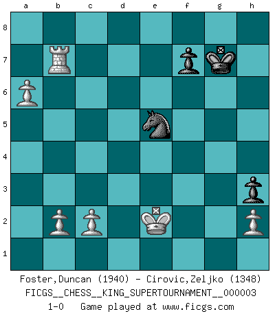 Last move : 1-0 2018 October 27 14:45:16 [Event "FICGS__CHESS__KING_SUPERTOURNAMENT__000003"] [Site "FICGS"] [Date "2018.09.16"] [Round "1"] [White "Foster,Duncan"] [Black "Cirovic,Zeljko"] [Result "1-0"] [WhiteElo "1940"] [BlackElo "1348"] 1.e4 e5 2.f4 exf4 3.Nf3 d5 4.exd5 Nf6 5.Bc4 Bc5 6.d4 Bb6 7.Qe2+ Qe7 8.Qxe7+ Kxe7 9.Bxf4 Re8 10.O-O Kf8 11.Nc3 Bg4 12.Na4 Re4 13.Nxb6 axb6 14.Bxc7 Bxf3 15.Rxf3 Rxd4 16.Bd6+ Kg8 17.Rf4 Rd2 18.Bd3 Nxd5 19.Rd4 Rxd3 20.Rxd3 Nf6 21.Bxb8 Rxb8 22.Rad1 g5 23.Rd8+ Rxd8 24.Rxd8+ Kg7 25.Rd6 Ne4 26.Rxb6 g4 27.Kf1 Nd2+ 28.Ke2 Nc4 29.Rb4 Ne5 30.a4 h5 31.Rxb7 h4 32.a5 h3 33.gxh3 gxh3 34.a6 1-0 KGA : Abbazia defense, Modern variation Kingside Castling by player White (move 10) 10 pieces endgame at move 33 : White KRPPPP , Black KNPP WHITE : King + 1 Rook 4 Pawns BLACK : King + 1 Knight 2 Pawns Player White won this chess game. Follow this game move after move (download)All I want to do, ever, is just play Chess. (Bobby Fischer) Je mehr ich von der FIDE weiss, um so weniger verstehe ich. (Alexander Kalifman) El Peón aislado arroja penumbra sobre todo el tablero. (Aaron Nimzovich) Toute estimation doit être constamment réévaluée. (Jacob Estrin) Panic is a sudden desertion of us, an a going over to the enemy of our imagination. (Christian Nevell Bovee)