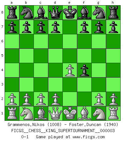 Last move : 0-1 2018 October 17 21:15:4 [Event "FICGS__CHESS__KING_SUPERTOURNAMENT__000003"] [Site "FICGS"] [Date "2018.09.16"] [Round "1"] [White "Grammenos,Nikos"] [Black "Foster,Duncan"] [Result "0-1"] [WhiteElo "1008"] [BlackElo "1940"] 1.e4 e5 2.f4 exf4 0-1 This chess game has been lost on time (started : 2018.09.16 2:52:46) King's gambit accepted Player Black won this chess game. Follow this game move after move (download)Pawn endings are to Chess what putting is to golf. (Cecil Purdy) Ohne Fehler kann es keine Brillanz geben. (Emanuel Lasker) Después de una mala apertura, hay una esperanza en el juego medio. Pero una vez que estas en finales, el momento de la verdad ha llegado. (Edmar Mednis) Des combinaisons [dans le jeu d'échecs] pareilles à des mélodies. Je crois entendre pour ainsi dire la musique des coups... (Vladimir Nabokov) Waiting for chance ? Play in casinos. (FICGS proverb)