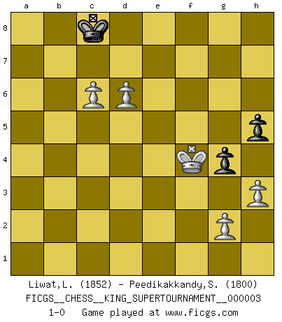 Last move : 1-0 2018 December 1 16:43:28 [Event "FICGS__CHESS__KING_SUPERTOURNAMENT__000003"] [Site "FICGS"] [Date "2018.09.16"] [Round "1"] [White "Liwat,Lowell"] [Black "Peedikakkandy,Sameer"] [Result "1-0"] [WhiteElo "1852"] [BlackElo "1800"] 1.e4 e5 2.f4 d5 3.exd5 exf4 4.Nf3 Nf6 5.Bb5+ Bd7 6.Qe2+ Qe7 7.Bxd7+ Nbxd7 8.d4 Qxe2+ 9.Kxe2 Nxd5 10.c4 N5f6 11.Bxf4 O-O-O 12.Nc3 Re8+ 13.Kd3 a6 14.h3 Bb4 15.Rhe1 Be7 16.Re2 h6 17.Rae1 Bd6 18.Rxe8+ Rxe8 19.Bxd6 cxd6 20.Rxe8+ Nxe8 21.Nd5 Nef6 22.Ne7+ Kd8 23.Nf5 Ne8 24.b4 b5 25.c5 dxc5 26.bxc5 a5 27.Ne5 Nxe5+ 28.dxe5 Kd7 29.Nd4 Nc7 30.c6+ Kc8 31.Ke4 b4 32.Nf5 Ne8 33.Nd6+ Nxd6+ 34.exd6 a4 35.Kd3 f5 36.Kc4 b3 37.axb3 axb3 38.Kxb3 f4 39.Kc2 g5 40.Kd3 h5 41.Ke4 g4 42.Kxf4 1-0 KGD : Falkbeer counter-gambit Queenside Castling by player Black (move 11) 10 pieces endgame at move 37 : White KPPPP , Black KPPPP WHITE : King + 4 Pawns BLACK : King + 4 Pawns 9 pieces endgame at move 38 : White KPPPP , Black KPPP WHITE : King + 4 Pawns BLACK : King + 3 Pawns 8 pieces endgame at move 42 : White KPPPP , Black KPP WHITE : King + 4 Pawns BLACK : King + 2 Pawns Player White won this chess game. Follow this game move after move (download)It is not a move, even the best move that you must seek, but a realizable plan. (Eugene Znosko-Borovsky) Dass jemand wie Surab Asmaiparaschwili, der selbst Elopunkte gekauft hat , Vize-Präsident der Fide werden konnte, sagt schon einges über den Zustand dieser Organisation aus. (Joel Lautier) Todos los Maestros de Ajedrez fueron un día unos principiantes. (Chernev) Aucun coup ne doit être joué sans but. (Pedro Damiano) The beginning of wisdom is silence. The second step is listening. (Unknown)