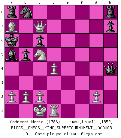 Last move : 1-0 2018 September 29 11:50:36 [Event "FICGS__CHESS__KING_SUPERTOURNAMENT__000003"] [Site "FICGS"] [Date "2018.09.16"] [Round "1"] [White "Andreoni,Mario"] [Black "Liwat,Lowell"] [Result "1-0"] [WhiteElo "1786"] [BlackElo "1852"] 1.e4 e5 2.f4 exf4 3.Nf3 g5 4.Bc4 d6 5.h4 f6 6.Nxg5 fxg5 7.Qh5+ Kd7 8.d4 Nf6 9.Qxg5 c6 10.Bxf4 Be7 11.Nc3 Kc7 12.e5 Ne4 13.exd6+ Nxd6 14.Qg3 Kb6 15.Na4+ Kc7 16.Nc5 b6 17.O-O-O b5 18.Be6 Kb6 19.Rhe1 Bxh4 20.Qh2 Bxe1 21.Bxd6 Bxe6 22.Nxe6 Qh4 23.Bc5+ Kb7 24.Qc7+ Ka6 25.Bxa7 Ba5 26.Nc5+ 1-0 KGA : King's knight's gambit Queenside Castling by player White (move 17) Player White won this chess game. Follow this game move after move (download)The most powerful weapon in Chess is to have the next move. (David Bronstein) Ja, ich habe einmal eine Blitzpartie gespielt, es war in einem Zug, 1929. --im Interview 1989 (Mikhail Moiseyevich Botvinik) Si el Ajedrez es una ciencia, es la mas inexacta. Si el Ajedrez es un arte, es demasiado inexacto para ser visto como tal. Si el Ajedrez es un deporte, es demasiado esotérico. Si el Ajedrez es un juego, es demasiado exigente para ser solo un juego. Si el Ajedrez es una aventura, es una muy demandante. Si el Ajedrez es una pasión, es una muy gratificante. Si el Ajedrez es la vida, es una muy triste. (Anónimo) Que feriez-vous si vous étiez en train de jouer aux échecs et que la fin du monde arrive ? Je continuerais à jouer. (Saint Borromée) Think like a man of action, act like a man of thought. (Henri Louis Bergson)