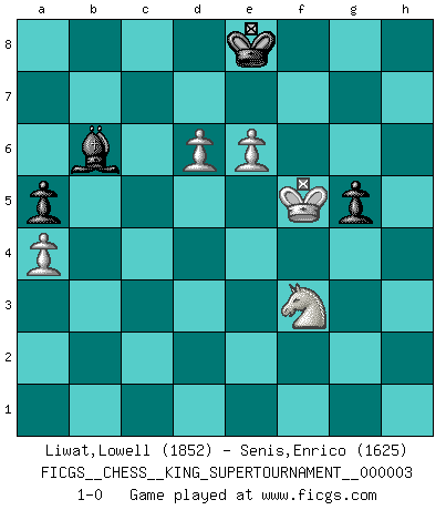 Last move : 1-0 2018 October 29 22:14:17 [Event "FICGS__CHESS__KING_SUPERTOURNAMENT__000003"] [Site "FICGS"] [Date "2018.09.16"] [Round "1"] [White "Liwat,Lowell"] [Black "Senis,Enrico"] [Result "1-0"] [WhiteElo "1852"] [BlackElo "1625"] 1.e4 e5 2.f4 d6 3.Nf3 Nf6 4.Nc3 Nc6 5.Bb5 exf4 6.d4 Be7 7.d5 a6 8.Bd3 Ne5 9.Bxf4 Nxf3+ 10.Qxf3 Bg4 11.Qe3 O-O 12.h3 Bh5 13.O-O Bg6 14.g4 h5 15.g5 Nd7 16.h4 Nc5 17.b4 Nxd3 18.cxd3 f6 19.d4 Re8 20.Rf2 Rf8 21.Raf1 Qd7 22.a4 Qg4+ 23.Qg3 Qxg3+ 24.Bxg3 fxg5 25.Rxf8+ Rxf8 26.Rxf8+ Kxf8 27.hxg5 Bxg5 28.e5 Ke7 29.Ne2 Bd3 30.Kf2 g6 31.Nf4 h4 32.Nxd3 hxg3+ 33.Kxg3 b6 34.Nf4 Kf7 35.Ne6 Be3 36.Nxc7 a5 37.bxa5 bxa5 38.Nb5 dxe5 39.dxe5 Bc5 40.Kf4 Be7 41.d6 Bd8 42.Nd4 g5+ 43.Kf5 Bb6 44.e6+ Ke8 45.Nf3 1-0 King's gambit Kingside Castling by player Black (move 11) Kingside Castling by player White (move 13) 10 pieces endgame at move 38 : White KNPPP , Black KBPPP WHITE : King + 1 Knight 3 Pawns BLACK : King + 1 Bishop 3 Pawns 9 pieces endgame at move 39 : White KNPPP , Black KBPP WHITE : King + 1 Knight 3 Pawns BLACK : King + 1 Bishop 2 Pawns Player White won this chess game. Follow this game move after move (download)Checkers is for tramps. (Paul Morphy) Wenn Capablanka heute auf der Schachbühne erscheinen würde, hätte er ein halbes Jahr gebraucht um sich die Schachtheorie anzueignen. Und dann hätte er alles und jeden besiegt. (Mikhail Moiseyevich Botvinik) El Ajedrez es sobre todo, ¡una pelea!. (Emanuel Lasker) L'ordinateur a tué l'originalité. Il n'y a plus guère d'aventures sur l'échiquier. (Jacob Murray) Excelling at chess has long been considered a symbol of more general intelligence. That is an incorrect assumption in my view, as pleasant as it might be. But for the purposes of argument and investigation, chess is, in Russkin-Gutman's words, 'an unparalleled laboratory, since both the learning process and the degree of ability obtained can be objectified and quantified, providing an excellent comparative framework on which to use rigorous analytical techniques.' (The Chess Master and the Computer, by Garry Kasparov - 2010)