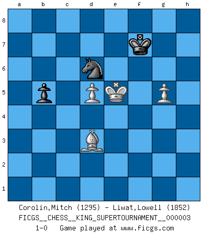 Last move : 1-0 2018 October 10 15:37:25 [Event "FICGS__CHESS__KING_SUPERTOURNAMENT__000003"] [Site "FICGS"] [Date "2018.09.16"] [Round "1"] [White "Corolin,Mitch"] [Black "Liwat,Lowell"] [Result "1-0"] [WhiteElo "1295"] [BlackElo "1852"] 1.e4 e5 2.f4 exf4 3.Nf3 g5 4.Bc4 d6 5.h4 g4 6.Ng5 Nh6 7.d4 f6 8.Bxf4 fxg5 9.Bxg5 Qd7 10.O-O Qg7 11.Qd2 Nc6 12.Nc3 Qxd4+ 13.Qxd4 Nxd4 14.Bf6 Nxc2 15.Bxh8 Ne3 16.Rxf8+ Kxf8 17.Bd3 g3 18.Bd4 Neg4 19.Nb5 Ne5 20.Bxe5 dxe5 21.Nxc7 Rb8 22.Rf1+ Kg7 23.Nb5 Be6 24.a3 a6 25.Nc7 Bg8 26.Rf3 Rc8 27.Nd5 Rc1+ 28.Rf1 Rxf1+ 29.Kxf1 Bxd5 30.exd5 Nf7 31.Ke2 Nd6 32.Kf3 h6 33.Kxg3 e4 34.Bc2 Nc4 35.Bxe4 Nxb2 36.Kf4 Nc4 37.a4 b5 38.axb5 axb5 39.Bd3 Kf6 40.g4 Nd6 41.g5+ hxg5+ 42.hxg5+ Kf7 43.Ke5 1-0 KGA : King's knight's gambit Kingside Castling by player White (move 10) 10 pieces endgame at move 38 : White KBPPPP , Black KNPP WHITE : King + 1 Bishop 4 Pawns BLACK : King + 1 Knight 2 Pawns 9 pieces endgame at move 38 : White KBPPP , Black KNPP WHITE : King + 1 Bishop 3 Pawns BLACK : King + 1 Knight 2 Pawns 8 pieces endgame at move 41 : White KBPP , Black KNPP WHITE : King + 1 Bishop 2 Pawns BLACK : King + 1 Knight 2 Pawns 7 pieces endgame at move 42 : White KBPP , Black KNP WHITE : King + 1 Bishop 2 Pawns BLACK : King + 1 Knight 1 Pawn Player White won this chess game. Follow this game move after move (download)It's always better to sacrifice your opponent's men. (Savielly Tartakover) Wer wird heute Abend ihr Gegner sein? -- Heute Abend spiele ich gegen die schwarzen Steine. (Akiba Rubinstein) Muchos se han convertido en Maestros de Ajedrez, nadie se ha convertido en el Maestro del Ajedrez. (Siegbert Tarrasch) Des combinaisons [dans le jeu d'échecs] pareilles à des mélodies. Je crois entendre pour ainsi dire la musique des coups... (Vladimir Nabokov) Lottery : A tax on people who are bad at math. (Author unknown)