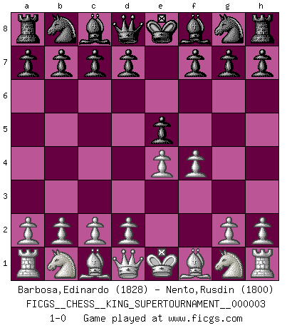 Last move : 1-0 2018 October 16 8:55:46 [Event "FICGS__CHESS__KING_SUPERTOURNAMENT__000003"] [Site "FICGS"] [Date "2018.09.16"] [Round "1"] [White "Barbosa,Edinardo"] [Black "Nento,Rusdin"] [Result "1-0"] [WhiteElo "1828"] [BlackElo "1800"] 1.e4 e5 2.f4 1-0 This chess game has been lost on time (started : 2018.09.16 2:52:46) King's gambit Player White won this chess game. Follow this game move after move (download)I'd rather have a Pawn than a finger. (Reuben Fine) Ich erzeugte keinen Neid, da mich die Schachspieler als Musiker und die Musiker als Schachspieler betrachteten. (Mark Taimanov) La batalla por la última verdad nunca sera ganada. Y es por eso que el Ajedrez es tan fascinante. (Hans Kmoch) J'apprécie les joueurs d'est-indienne, c'est grâce à eux que je nourris ma famille depuis tant d'années. (Petrosian) Man is reluctant to give credit for intelligence to anyone, except his enemies. (Albert Einstein)