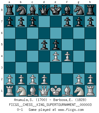 Last move : 0-1 2018 October 16 20:58:30 [Event "FICGS__CHESS__KING_SUPERTOURNAMENT__000003"] [Site "FICGS"] [Date "2018.09.16"] [Round "1"] [White "Anumula,Siddhartha Vijay Raj"] [Black "Barbosa,Edinardo"] [Result "0-1"] [WhiteElo "1700"] [BlackElo "1828"] 1.e4 e5 2.f4 d5 0-1 This chess game has been lost on time (started : 2018.09.16 2:52:46) KGD : Falkbeer counter-gambit Player Black won this chess game. Follow this game move after move (download)A big shock; the best chess player in history has passed away. (Lajos Portisch, about Bobby Fischer's death) Er war ein guter Schachspieler, aber ich kann Leute nicht ausstehen, die 'Heil Hitler' rufen (Über Alexander Aljechin). (Miguel Najdorf) Una clavada es mas poderosa que una espada. (Fred Reinfeld) Toutes les manuvres exécutées sur une colonne ouverte ont pour but ultime l'intrusion définitive sur la septième ou la huitième rangée, en plein cur de la position ennemie. (Aaron Nimzovitch) Those who make the worst use of their time are the first to complain of its brevity. (Jean de la Bruyere)
