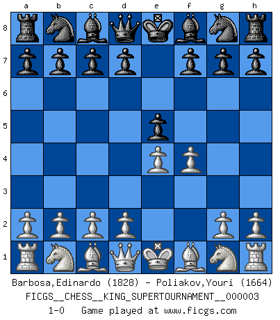 Last move : 1-0 2018 September 16 14:5:50 [Event "FICGS__CHESS__KING_SUPERTOURNAMENT__000003"] [Site "FICGS"] [Date "2018.09.16"] [Round "1"] [White "Barbosa,Edinardo"] [Black "Poliakov,Youri"] [Result "1-0"] [WhiteElo "1828"] [BlackElo "1664"] 1.e4 e5 2.f4 1-0 King's gambit Player White won this chess game. Follow this game move after move (download)Chess is thirty to forty percent psychology. You don't have this when you play a computer. I can't confuse it. (Judith Polgar) Der Verteidiger gebe der Gewalt nach, aber nur der Gewalt. Er schaffe sich nicht freiwillig, etwa aus Blindheit oder aus Schrecken, irgendwelche Schwächen. Er lasse sich nicht bluffen. (Emanuel Lasker) Bobby Fischer es el jugador de Ajedrez mas grande que jamás haya existido. (Ken Smith) Il n'y a pas de prix trop élevé au scalp de l'ennemi. (Koblentz) When I took office, only high energy physicists had ever heard of what is called the World Wide Web... Now even my cat has its own page. (Bill Clinton, 1996)