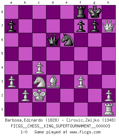Last move : 1-0 2018 October 3 3:0:46 [Event "FICGS__CHESS__KING_SUPERTOURNAMENT__000003"] [Site "FICGS"] [Date "2018.09.16"] [Round "1"] [White "Barbosa,Edinardo"] [Black "Cirovic,Zeljko"] [Result "1-0"] [WhiteElo "1828"] [BlackElo "1348"] 1.e4 e5 2.f4 exf4 3.Nf3 d5 4.exd5 Nf6 5.c4 Bg4 6.d4 Bb4+ 7.Nc3 Ne4 8.Qa4+ c6 9.Qxb4 Bxf3 10.gxf3 Qh4+ 11.Kd1 Nf2+ 12.Kc2 Nxh1 13.Qxb7 O-O 14.Qxa8 Qf2+ 15.Be2 Qxd4 16.Bxf4 Qxf4 17.Rxh1 cxd5 18.Qxd5 Na6 19.a3 Nc7 20.Qe4 Qd6 21.Bd3 Ne6 22.Qxh7+ 1-0 KGA : Abbazia defense, Modern variation Kingside Castling by player Black (move 13) Player White won this chess game. Follow this game move after move (download)The only thing Chess players have in common is Chess. (Lodewijk Prins) Ich bewundere Kasparows phantasievolle Angriffssiege aus den Achtzigern und Neunzigern, aber wenn man sie mit dem Computer überprüft, nimmt der Computer in jeder zweiten Partie die Opfer an, verteidigt sich und gewinnt. (Vladimir Kramnik) Ciertamente, de todas la drogas del mundo, el Ajedrez debe ser el mas placentero permamentemente. (Assiac) Je ne suis pas le dernier à jouer lâchement des coups douteux pendant le zeïtnot de l'adversaire pour l'achever: en effet les coups qui font le plus peur sont ceux que l'on ne comprend pas. Je me fais souvent peur quand je joue. (Un professeur anonyme) Chess is as much a mystery as women. (Purdy)