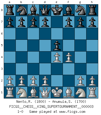 Last move : 1-0 2018 October 16 8:55:46 [Event "FICGS__CHESS__KING_SUPERTOURNAMENT__000003"] [Site "FICGS"] [Date "2018.09.16"] [Round "1"] [White "Nento,Rusdin"] [Black "Anumula,Siddhartha Vijay Raj"] [Result "1-0"] [WhiteElo "1800"] [BlackElo "1700"] 1.e4 e5 2.f4 1-0 This chess game has been lost on time (started : 2018.09.16 2:52:46) King's gambit Player White won this chess game. Follow this game move after move (download)Fischer is an American Chess tragedy on par with Morphy and Pillsbury. (Mig Greengard) Du musst nicht gut spielen, es reicht, wenn du besser spielst als dein Gegner. (Anonymous) Uno no tiene que jugar muy bien, es suficiente jugar mejor que el oponente. (Siegbert Tarrasch) Un journaliste : 'Vous préférez avoir une dame de plus sur l'échiquier ou au lit ?' Boris Spassky : 'Ca dépend de la position.' God is an atheist. (Unknown)