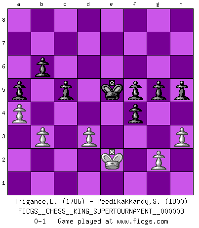 Last move : 0-1 2018 December 8 8:28:40 [Event "FICGS__CHESS__KING_SUPERTOURNAMENT__000003"] [Site "FICGS"] [Date "2018.09.16"] [Round "1"] [White "Trigance,Emile"] [Black "Peedikakkandy,Sameer"] [Result "0-1"] [WhiteElo "1786"] [BlackElo "1800"] 1.e4 e5 2.f4 exf4 3.Nf3 d6 4.Bc4 h6 5.b3 Nc6 6.Bb2 Nf6 7.e5 dxe5 8.Nxe5 Nxe5 9.Qe2 Bd6 10.Bxe5 O-O 11.O-O Re8 12.d4 Bxe5 13.dxe5 Qd4+ 14.Qf2 Qxa1 15.exf6 Qxf6 16.Nd2 Be6 17.Bd3 b6 18.Qf3 c5 19.Ne4 Qd4+ 20.Qf2 Qxf2+ 21.Rxf2 g5 22.Nf6+ Kg7 23.Nxe8+ Rxe8 24.Re2 Bd7 25.Kf2 Rxe2+ 26.Kxe2 Kf6 27.a4 a5 28.Kf2 Bf5 29.Kf3 Bxd3 30.cxd3 Ke5 31.Ke2 f5 32.h3 h5 0-1 KGA : Fischer defense Kingside Castling by player Black (move 10) Kingside Castling by player White (move 11) Player Black won this chess game. Follow this game move after move (download)Fischer Chess play was always razor-sharp, rational and brilliant. One of the best ever. (Dave Regis) Ich las kürzlich ein Buch von Nietzsche. Er sagte Religion verdumme nur die Menschen. Ich stimme zu. (Robert James Fischer) Nos gusta pensar. (Gary Kasparov) Tous ces prétendus hommes politiques sont les pions, les Cavaliers, les Tours ou les Fous d'une partie d'échecs qui se jouera tant qu'un hasard ne renversera pas l'échiquier. (Honoré de Balzac) No enterprise is more likely to succeed than one concealed from the enemy until it is ripe for execution. (Niccolo Machiavelli)