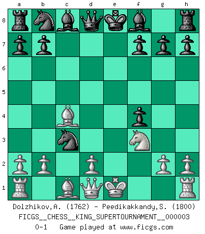 Last move : 0-1 2018 November 11 22:28:31 [Event "FICGS__CHESS__KING_SUPERTOURNAMENT__000003"] [Site "FICGS"] [Date "2018.09.16"] [Round "1"] [White "Dolzhikov,Aleksandr"] [Black "Peedikakkandy,Sameer"] [Result "0-1"] [WhiteElo "1762"] [BlackElo "1800"] 1.e4 e5 2.f4 d5 3.exd5 exf4 4.Nf3 Nf6 5.c4 c6 6.Nc3 cxd5 7.cxd5 Nxd5 8.Bc4 Nxc3 0-1 This chess game has been lost on time (started : 2018.09.16 2:52:46) KGD : Falkbeer counter-gambit Player Black won this chess game. Follow this game move after move (download)When asked, -How is that you pick better moves than your opponents?, I responded: I'm very glad you asked me that, because, as it happens, there is a very simple answer. I think up my own moves, and I make my opponent think up his. (Alexander Alekhine) Schach ist gnadenlos. Du mußt bereit sein zu töten. (Nigel Short) La esencia del Ajedrez es pensar acerca de lo que el Ajedrez es. (David Bronstein) Tout change constamment, y compris dans le monde des Echecs. (Botvinnik) The ultimate in disposing one's troops is to be without ascertainable shape. Then the most penetrating spies cannot pry in nor can the wise lay plans against you. (Sun Tzu)
