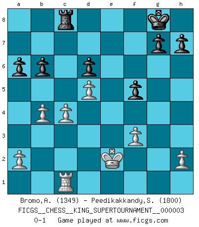 Last move : 0-1 2018 December 19 14:15:16 [Event "FICGS__CHESS__KING_SUPERTOURNAMENT__000003"] [Site "FICGS"] [Date "2018.09.16"] [Round "1"] [White "Bromo,Alexis"] [Black "Peedikakkandy,Sameer"] [Result "0-1"] [WhiteElo "1349"] [BlackElo "1800"] 1.e4 e5 2.f4 d5 3.d3 dxe4 4.dxe4 exf4 5.Nf3 Qxd1+ 6.Kxd1 Bg4 7.Be2 Nc6 8.Bxf4 Bd6 9.Bxd6 cxd6 10.Nc3 Nf6 11.Nd5 Nxd5 12.exd5 Bxf3 13.Bxf3 Ne5 14.Re1 O-O 15.b3 Nxf3 16.gxf3 Rfe8 17.c4 Rxe1+ 18.Kxe1 a6 19.b4 Rc8 20.Rc1 b6 21.Ke2 f5 0-1 This chess game has been lost on time (started : 2018.09.16 2:52:46) KGD : Falkbeer counter-gambit Kingside Castling by player Black (move 14) Player Black won this chess game. Follow this game move after move (download)Becoming successful at Chess allows you to discover your own personality. That's what I want for the kids I teach. (Saudin Robovic) Die unerbitterlichsten Regeln im Schach sind die Ausnahmen. (Savielly Grigorievitsch Tartakower) Si tu oponente no puede hacer nada activo, entonces no apures la posición; En vez de eso, dejalo estar sentado ahí, sufriendo y rogandote por un empate. (Jeremy Silman) Botvinnik disait en comparant les échecs à la musique: Il existe une science dont le but est l'étude de l'acoustique et des sons. Mais il y a aussi un art qui se sert de l'océan des sons : c'est la musique. De toute évidence, il en est de même pour la pensée. La logique est l'étude des lois de la réflexion et les échecs reflètent, en tant qu'art, le côté logique de la réflexion, sous la forme d'images artistiques... Extrait de Fischer - Spassky, Reykjavik 1972 par Alexander & F. Wyndham (Ed. Solar), p 37. However beautiful the strategy, you should occasionally look at the results. (Winston Churchill)