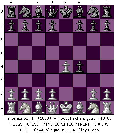 Last move : 0-1 2018 October 16 8:55:46 [Event "FICGS__CHESS__KING_SUPERTOURNAMENT__000003"] [Site "FICGS"] [Date "2018.09.16"] [Round "1"] [White "Grammenos,Nikos"] [Black "Peedikakkandy,Sameer"] [Result "0-1"] [WhiteElo "1008"] [BlackElo "1800"] 1.e4 e5 2.f4 exf4 0-1 This chess game has been lost on time (started : 2018.09.16 2:52:46) King's gambit accepted Player Black won this chess game. Follow this game move after move (download)Combinations have always been the most intriguing aspect of Chess. The masters look for them, the public applauds them, the critics praise them. It is because combinations are possible that Chess is more than a lifeless mathematical exercise. They are the poetry of the game; they are to Chess what melody is to music. They represent the triumph of mind over matter. (Reuben Fine) Sie führen leise Selbstgespräche, schlürfen lautstark ihre Getränke, schmatzen hörbar beim Essen, blasen ihrem Gegenüber Rauch in die Augen, niesen ihm ins Gesicht, starren ihn unverwandt an, bis er sich unter ihren Blicken windet, rutschen ständig auf ihrem Stuhl hin und her, rülpsen und bohren in der Nase. (Anonymous) Botvinnik trató de alejar el misterio referente al Ajedrez, siempre relacionandolo a situaciones de la vida diaria. Solía llamar al Ajedrez un problema inexacto típico, similar a aquellos en que la gente tiene siempre que resolver a cada día. (Garry Kasparov) Les Echecs mettent en conflit, non pas deux intelligences, mais deux volontés. (Lasker) There are lots of people who mistake their imagination for their memory. (Josh Bilings)