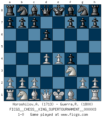Last move : 1-0 2018 October 27 22:6:4 [Event "FICGS__CHESS__KING_SUPERTOURNAMENT__000003"] [Site "FICGS"] [Date "2018.09.16"] [Round "1"] [White "Horoshilov,Andrey"] [Black "Guerra,Rodrigo"] [Result "1-0"] [WhiteElo "1713"] [BlackElo "1800"] 1.e4 e5 2.f4 d6 3.Nf3 exf4 4.d4 1-0 This chess game has been lost on time (started : 2018.09.16 2:52:46) King's gambit Player White won this chess game. Follow this game move after move (download)The game of chess is the touchstone of the intellect. (Goethe) Ich erzeugte keinen Neid, da mich die Schachspieler als Musiker und die Musiker als Schachspieler betrachteten. (Mark Taimanov) Todavía soy una víctima del Ajedrez. Tiene toda la belleza del arte y mucho mas. No puede ser comercializado. El Ajedrez es mas puro que el arte en su posición social. (Marcel Duchamp) J'apprécie les joueurs d'est-indienne, c'est grâce à eux que je nourris ma famille depuis tant d'années. (Petrosian) A specialist learns more and more about less and less until he knows everything about nothing. (Nicholas Murray Butler)