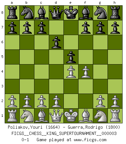 Last move : 0-1 2018 September 16 14:4:22 [Event "FICGS__CHESS__KING_SUPERTOURNAMENT__000003"] [Site "FICGS"] [Date "2018.09.16"] [Round "1"] [White "Poliakov,Youri"] [Black "Guerra,Rodrigo"] [Result "0-1"] [WhiteElo "1664"] [BlackElo "1800"] 1.e4 e5 2.f4 d6 0-1 King's gambit Player Black won this chess game. Follow this game move after move (download)The older I grow, the more I value Pawns. (Keres) Ich spiele 70 Eröffnungssysteme. (Viktor Kortschnoi) Fischer no está bajo la obligación de nadie. (Joseph Platz) Tout change constamment, y compris dans le monde des Echecs. (Botvinnik) In every real man a child is hidden that wants to play. (Friedrich Nietzsche)
