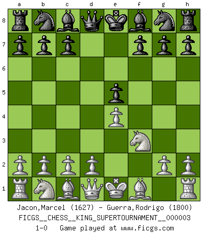 Last move : 1-0 2018 October 21 21:44:57 [Event "FICGS__CHESS__KING_SUPERTOURNAMENT__000003"] [Site "FICGS"] [Date "2018.09.16"] [Round "1"] [White "Jacon,Marcel"] [Black "Guerra,Rodrigo"] [Result "1-0"] [WhiteElo "1627"] [BlackElo "1800"] 1.e4 e5 2.f4 d6 3.fxe5 dxe5 4.Nf3 1-0 This chess game has been lost on time (started : 2018.09.16 2:52:46) King's gambit Player White won this chess game. Follow this game move after move (download)I like to say that Bobby Fischer was the greatest player ever. But what made Fischer a genius was his ability to blend an American freshness and pragmatism with Russian ideas about strategy. (Bruce Pandolfini) Im Schach gibt es keinen Platz für Galanterie. (Irving Chernev) Una buena ofensiva y una buena defensa, comienzan ambas con un buen desarrollo. (Bruce A. Moon) La solitude du joueur d'Echecs à l'approche du mat est semblable à celle du condamné. (Francis Szpiner) Programming can only do so much before it becomes too much. (Don Groves)