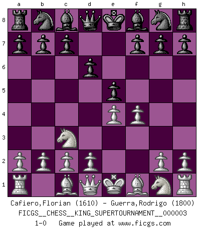 Last move : 1-0 2018 December 8 12:47:32 [Event "FICGS__CHESS__KING_SUPERTOURNAMENT__000003"] [Site "FICGS"] [Date "2018.09.16"] [Round "1"] [White "Cafiero,Florian"] [Black "Guerra,Rodrigo"] [Result "1-0"] [WhiteElo "1610"] [BlackElo "1800"] 1.e4 e5 2.f4 d6 3.Nc3 1-0 This chess game has been lost on time (started : 2018.09.16 2:52:46) King's gambit Player White won this chess game. Follow this game move after move (download)When I have White, I win because I am white; When I have Black, I win because I am Bogolyubov. (Bogolyubov) Die Fehler sind da, Sie warten nur darauf gemacht zu werden. (Savielly Grigorievitsch Tartakower) El Ajedrez es parte de la cultura, y si una cultura esta en decadencia, entonces también el Ajedrez declinará. (Mikhail Botvinnik) Un journaliste : 'Vous préférez avoir une dame de plus sur l'échiquier ou au lit ?' Boris Spassky : 'Ca dépend de la position.' History is the quarrels of popes and kings, with wars or pestilences in every page; the men all so good for nothing, and hardly any women at all. (Jane Austen)