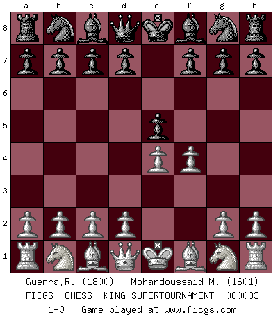Last move : 1-0 2018 October 16 8:55:46 [Event "FICGS__CHESS__KING_SUPERTOURNAMENT__000003"] [Site "FICGS"] [Date "2018.09.16"] [Round "1"] [White "Guerra,Rodrigo"] [Black "Mohandoussaid,Malik"] [Result "1-0"] [WhiteElo "1800"] [BlackElo "1601"] 1.e4 e5 2.f4 1-0 This chess game has been lost on time (started : 2018.09.16 2:52:46) King's gambit Player White won this chess game. Follow this game move after move (download)The Chess pieces are the block alphabet which shapes thoughts; and these thoughts, although making a visual design on the chessboard, express their beauty abstractly, like a poem. (Marcel Duchamp) In Buenos Aires ist es nicht mein vorrangiges Ziel ein starkes Turnier zu organisieren, sondern ein Turnier für Gentlemen. Ich würde nie Kamsky einladen. Ich mag keine Probleme. (Miguel Najdorf) Si tu oponente no puede hacer nada activo, entonces no apures la posición; En vez de eso, dejalo estar sentado ahí, sufriendo y rogandote por un empate. (Jeremy Silman) La tactique, c'est ce que vous faites quand il y a quelque chose à faire; la stratégie, c'est ce que vous faites quand il n'y a rien à faire. (Savielli Tartacower) Horse racing is animated roulette. (Roger Kahn)