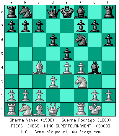 Last move : 1-0 2018 October 21 9:44:40 [Event "FICGS__CHESS__KING_SUPERTOURNAMENT__000003"] [Site "FICGS"] [Date "2018.09.16"] [Round "1"] [White "Sharma,Vivek"] [Black "Guerra,Rodrigo"] [Result "1-0"] [WhiteElo "1588"] [BlackElo "1800"] 1.e4 e5 2.f4 d6 3.Nf3 Bg4 4.Bc4 h6 5.O-O Nf6 6.d3 1-0 This chess game has been lost on time (started : 2018.09.16 2:52:46) King's gambit Kingside Castling by player White (move 5) Player White won this chess game. Follow this game move after move (download)Chess is thirty to forty percent psychology. You don't have this when you play a computer. I can't confuse it. (Judith Polgar) Es gibt nur zwei wahre Schachgenies - das andere war Wilhelm Steinitz, der Weltmeister von 1872 bis 1894. (Robert James Fischer) Solo los afeminados hacen el Enroque. (Rob Sillars) Les échecs sont un jeu par leur forme, un art par leur essence et une science par sa difficulté d'acquisition. Ils peuvent vous procurer autant de plaisir qu'un bon livre ou une belle musique, mais vous n'aurez une réelle joie que si vous arrivez à bien jouer. (Tigran Petrosian) He is a liar. I just don't know what the lie is yet. (Horatio Caine, C.S.I. Miami)