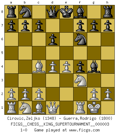 Last move : 1-0 2018 October 21 9:44:40 [Event "FICGS__CHESS__KING_SUPERTOURNAMENT__000003"] [Site "FICGS"] [Date "2018.09.16"] [Round "1"] [White "Cirovic,Zeljko"] [Black "Guerra,Rodrigo"] [Result "1-0"] [WhiteElo "1348"] [BlackElo "1800"] 1.e4 e5 2.f4 d6 3.Nf3 exf4 4.d4 Bg4 5.Bc4 Nf6 6.O-O 1-0 This chess game has been lost on time (started : 2018.09.16 2:52:46) King's gambit Kingside Castling by player White (move 6) Player White won this chess game. Follow this game move after move (download)In Chess, just as in life, today's bliss may be tomorrow's poison. (Assaic) Verschiedene, sehr schätzbare und im Laufe des Lebens nützliche Eigenschaften des Geistes können durch das Schachspiel erworben und gekräftigt werden, so dass sie zu Gewohnheiten werden, die uns nie im Stich lassen. (Benjamin Franklin) Nos gusta pensar. (Gary Kasparov) Même un GMI sait rarement calculer sur plus de cinq coups une attaque à sacrifices. (Rudolf Spielmann) This is where the fun begins. (Anakin Skywalker in Star Wars ep.3)