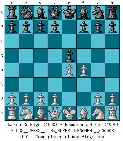 Last move : 1-0 2018 October 16 8:55:46 [Event "FICGS__CHESS__KING_SUPERTOURNAMENT__000003"] [Site "FICGS"] [Date "2018.09.16"] [Round "1"] [White "Guerra,Rodrigo"] [Black "Grammenos,Nikos"] [Result "1-0"] [WhiteElo "1800"] [BlackElo "1008"] 1.e4 e5 2.f4 1-0 This chess game has been lost on time (started : 2018.09.16 2:52:46) King's gambit Player White won this chess game. Follow this game move after move (download)Who is your opponent tonight, tonight I am playing against the Black pieces. (Akiba Rubinstein) Jeder weiß, dass Gasprom Putins persönliches Machtinstrument ist. Die Firma wird vom Kreml aus geleitet und wird schon deshalb nie transparent sein. (Garry Kasparov) Aquel que ve no otra dirección en el juego que la de dar Jaque Mate a su oponente, nunca será un buen jugador de Ajedrez. (Euwe) Je menace de comprendre la position. (Anonyme) The weakness of an artist is dogma. (Josh Waitzkin)