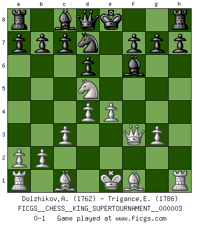 Last move : 0-1 2018 November 13 22:31:34 [Event "FICGS__CHESS__KING_SUPERTOURNAMENT__000003"] [Site "FICGS"] [Date "2018.09.16"] [Round "1"] [White "Dolzhikov,Aleksandr"] [Black "Trigance,Emile"] [Result "0-1"] [WhiteElo "1762"] [BlackElo "1786"] 1.e4 e5 2.f4 Qh4+ 3.g3 Qe7 4.Nc3 exf4 5.Qf3 fxg3 6.hxg3 Nc6 7.Nd5 Qd8 8.c3 Be7 9.d4 d6 10.Nh3 Nf6 11.Nhf4 Nb8 12.Nxf6+ Bxf6 13.Nd5 Nd7 0-1 This chess game has been lost on time (started : 2018.09.16 2:52:46) KGD : Keene's defense Player Black won this chess game. Follow this game move after move (download)By the beauty of his games, the clarity of his play, and the brilliance of his ideas, Fischer made himself an artist of the same stature as Brahms, Rembrandt, and Shakespeare. (David Levy) Pläne sind die Träume des Verständigen. (Ernst Freiherr von Feuchtersleben) Yo tuve un dolor de muelas en la primer partida. En el segundo juego, tuve un dolor de cabeza. En el tercero, tuve un ataque de reumatísmo. En la cuarta partida, no me sentía muy bien. ¿Y en el quinto juego? Bueno, ¿que acaso uno tiene que ganar todos los juegos?. (Siegbert Tarrasch) On a dit que l'homme se distingue de l'animal par le fait qu'il achète plus de livres qu'il ne peut en lire. Je voudrais suggérer qu'inclure à la liste des livres quelques livres d'échecs rendrait la distinction manifeste. (Edward Lasker) Coffee just isn't my cup of tea. (Unknown)