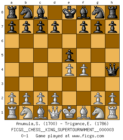 Last move : 0-1 2018 October 17 9:15:1 [Event "FICGS__CHESS__KING_SUPERTOURNAMENT__000003"] [Site "FICGS"] [Date "2018.09.16"] [Round "1"] [White "Anumula,Siddhartha Vijay Raj"] [Black "Trigance,Emile"] [Result "0-1"] [WhiteElo "1700"] [BlackElo "1786"] 1.e4 e5 2.f4 Qh4+ 0-1 This chess game has been lost on time (started : 2018.09.16 2:52:46) King's gambit Player Black won this chess game. Follow this game move after move (download)I have added these principles to the law: get the Knights into action before both Bishops are developed. (Emanuel Lasker) Schach ist ein Reich, wo sich die menschliche Phantasie frei entfalten kann. (David Bronstein) Ciertamente el estado mental actual de Bobby Fischer es una tragedia. Uno de los mas grandes jugadores de Ajedrez del mundo -el orgullo y pena del Ajedrez Americano. (Frank Brady) Les échecs sont un jeu terrible. Si vous n'avez pas le centre, votre adversaire a une position plus libre. Par contre, si vous avez le centre, alors vous avez vraiment quelque chose pour laquelle vous inquiéter ! (Siegbert Tarrasch) All the troubles of the world come from being unable to sit alone in a quiet room. (Blaise Pascal)