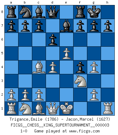 Last move : 1-0 2018 November 6 22:1:47 [Event "FICGS__CHESS__KING_SUPERTOURNAMENT__000003"] [Site "FICGS"] [Date "2018.09.16"] [Round "1"] [White "Trigance,Emile"] [Black "Jacon,Marcel"] [Result "1-0"] [WhiteElo "1786"] [BlackElo "1627"] 1.e4 e5 2.f4 exf4 3.Nf3 Nf6 4.e5 Ng4 5.Bc4 Be7 6.h3 O-O 7.hxg4 d6 8.d4 1-0 This chess game has been lost on time (started : 2018.09.16 2:52:46) KGA : Schallop defense Kingside Castling by player Black (move 6) Player White won this chess game. Follow this game move after move (download)Chess is a part of culture and if a culture is declining then Chess too will decline. (Mikhail Botvinnik) Jeder Fehler erscheint unglaublich dumm, wenn andre ihn begehen. (Georg Christoph Lichtenberg) El Ajedrez es tan inspirador que yo no creo que un buen jugador sea capaz de tener un pensamiento malo durante una partida. (Wilhelm Steinitz) Les échecs sont utiles à l'exercice de la faculté de penser et à celle de l'imagination. Car nous devons posséder une méthode élaborée pour atteindre des buts partout où nous devons conduire notre raison. (Leibnitz) Nobody is always a winner, and anybody who says he is, is either a liar or doesn't play poker. (Amarillo Slim)