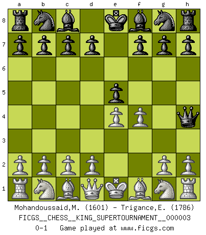 Last move : 0-1 2018 October 17 9:15:1 [Event "FICGS__CHESS__KING_SUPERTOURNAMENT__000003"] [Site "FICGS"] [Date "2018.09.16"] [Round "1"] [White "Mohandoussaid,Malik"] [Black "Trigance,Emile"] [Result "0-1"] [WhiteElo "1601"] [BlackElo "1786"] 1.e4 e5 2.f4 Qh4+ 0-1 This chess game has been lost on time (started : 2018.09.16 2:52:46) King's gambit Player Black won this chess game. Follow this game move after move (download)Every Chess master was once a beginner. (Chernev) Mein erstes Ziel war nicht, die Partie zu gewinnen, sondern eine Figur zu opfern. -- der junge (Wilhelm Steinitz) El jugador blanco perdió porque fallo en recordar la coreccta continuación y tuvo que pensar por sí mismo las movidas. (Siegbert Tarrasch) Ne tendez aucun piège pour le plaisir ! Ne jouez rien dans l'espoir que l'adversaire réagisse de façon stupide ! Prenez toujours pour acquis que l'adversaire va trouver le meilleur coup ! Ne jouez jamais de coup dans l'espoir que l'adversaire ne voie pas la menace ! Chacun de vos coups doit améliorer la position d'une façon ou d'une autre. It's not the will to win, but the will to prepare to win that makes the difference. (Bear Bryant)