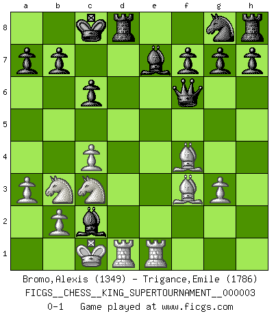 Last move : 0-1 2018 November 18 14:47:13 [Event "FICGS__CHESS__KING_SUPERTOURNAMENT__000003"] [Site "FICGS"] [Date "2018.09.16"] [Round "1"] [White "Bromo,Alexis"] [Black "Trigance,Emile"] [Result "0-1"] [WhiteElo "1349"] [BlackElo "1786"] 1.e4 e5 2.f4 Qh4+ 3.g3 Qe7 4.d3 d5 5.exd5 exf4 6.Be2 fxg3 7.hxg3 Qe5 8.Bf4 Qxd5 9.Nf3 c6 10.c4 Bb4+ 11.Nc3 Qa5 12.Qc2 Bf5 13.a3 Nd7 14.O-O-O Be7 15.Nd4 Bg6 16.Nb3 Qf5 17.Nd4 Qa5 18.Rhe1 O-O-O 19.Nb3 Qf5 20.Nd4 Qf6 21.Nb3 Nb6 22.Bf3 Nxc4 23.dxc4 Bxc2 0-1 KGD : Keene's defense Queenside Castling by player White (move 14) Queenside Castling by player Black (move 18) Player Black won this chess game. Follow this game move after move (download)Chess is a terrible game. If you have no center, your opponent has a freer position. If you do have a center, then you really have something to worry about ! (Siegbert Tarrasch) Wie ich sie so einen nach dem anderen nieder mähte wurde meine Überlegenheit offensichtlich. (José Raúl Capablanca) Nos gusta pensar. (Gary Kasparov) Les échecs c'est le défi de l'alpiniste, toujours plus haut, prêt à tout pour monter à l'assaut du Roi ennemi. Les échecs, c'est de la musique en mouvement, un ballet majestueux pour les yeux. C'est de la poésie composée par les fantômes du passé qui au même titre que Rimbaud ou Verlaine méritent notre admiration. Les échecs, c'est de la peinture ou le moindre mouvement modifie le tableau pour en faire un Picasso ou un Van Gogh. Les échecs, c'est tout et rien, c'est la vie et la mort. Jjulie33 sur le forum de France-Echecs. The bottom line is always the bottom line. (Johann Piek)