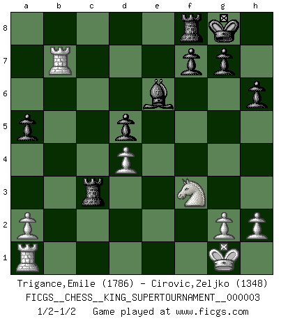 Last move : 1/2-1/2 2018 October 13 18:36:33 [Event "FICGS__CHESS__KING_SUPERTOURNAMENT__000003"] [Site "FICGS"] [Date "2018.09.16"] [Round "1"] [White "Trigance,Emile"] [Black "Cirovic,Zeljko"] [Result "1/2-1/2"] [WhiteElo "1786"] [BlackElo "1348"] 1.e4 e5 2.f4 exf4 3.Nf3 d5 4.exd5 c6 5.d4 cxd5 6.Bxf4 Nc6 7.Bb5 Be6 8.O-O Bd6 9.Be5 Bxe5 10.Nxe5 Nge7 11.c3 Qb6 12.Qe2 O-O 13.Nxc6 Nxc6 14.Bd3 Rae8 15.Qc2 h6 16.Nd2 Rc8 17.Nf3 Nb4 18.Qb1 Nxd3 19.Qxd3 Qxb2 20.Rfb1 Qxc3 21.Qxc3 Rxc3 22.Rxb7 a5 1/2-1/2 KGA : Abbazia defense (Classical defense, Modern defense!) Kingside Castling by player White (move 8) Kingside Castling by player Black (move 12) This chess game ended in a draw. Follow this game move after move (download)Fischer is the strongest player in the world. In fact, the strongest player who ever lived. (Larry Evans) Schach ist wie eine schöne Frau, zu der wir ständig zurückkehren, gleichviel, wie oft sie uns zurückweist. (Anonymous) Tu no necesitas jugar muy bien, únicamente ayudar a tu oponenet a que juegue muy mal. (Genrikh Chepukaitis) Les Echecs sont et restent toujours un combat, un combat intégral comme la boxe, la lutte ou un autre sport, et où il doit y avoir un vainqueur et un vaincu. (Joseph Emil Diemer) Statistics can be made to prove anything - even the truth. (Author unknown)